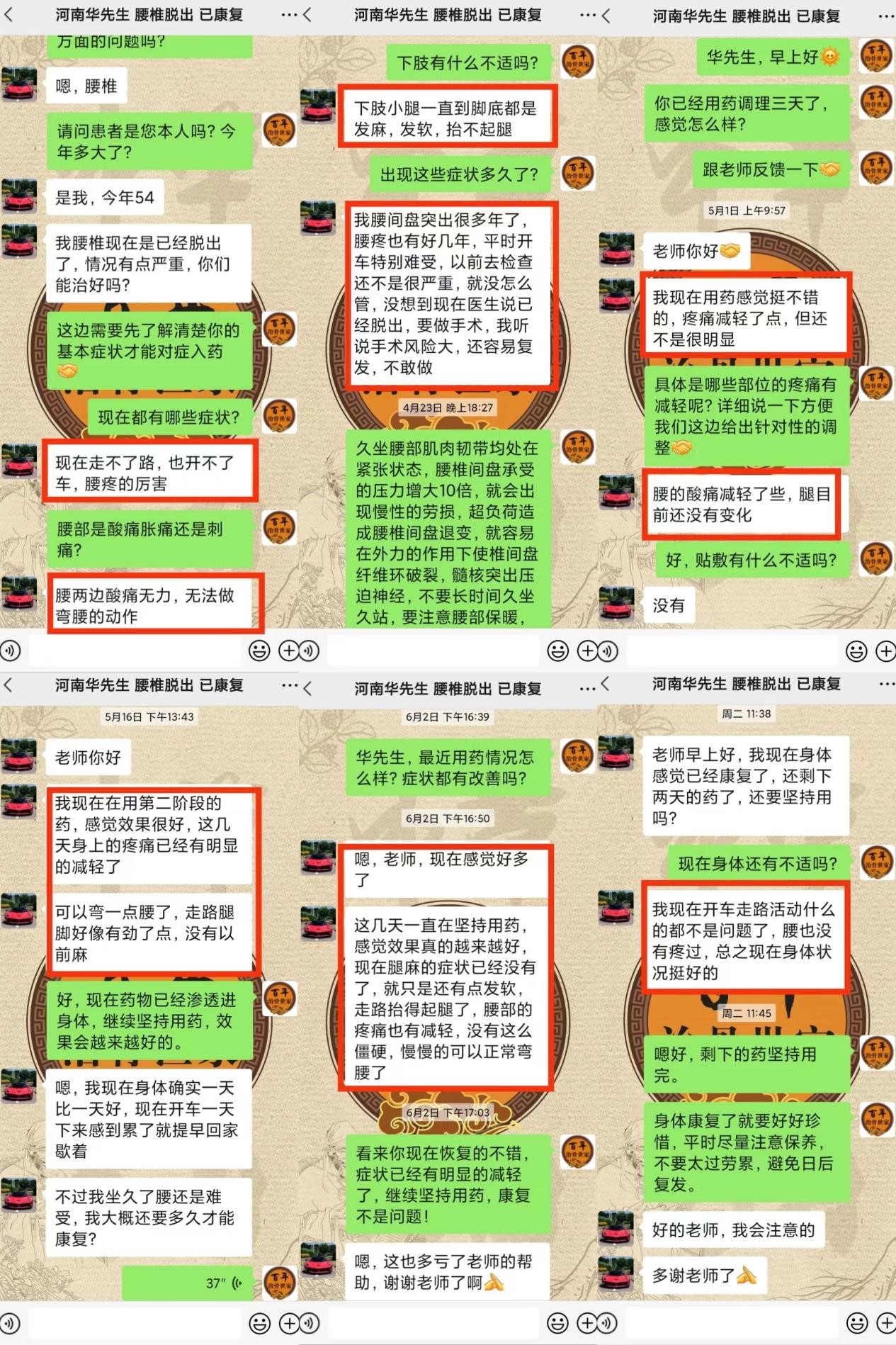 57 - 我今年42岁,腰椎病已经有5-6年了,去年检查说是腰椎间盘突出,腰椎酸痛,犯病时不敢直腰,双腿发麻,最后在病友群里看到了中医传承世家的可以治疗腰椎间盘突出,我就买了2个月的,用了感觉还不错,两只腿也不麻了,能干一些轻松的工作,现在我已经基本没有什么问题了,按照李老师的指导,再巩固一段时间就可以了。